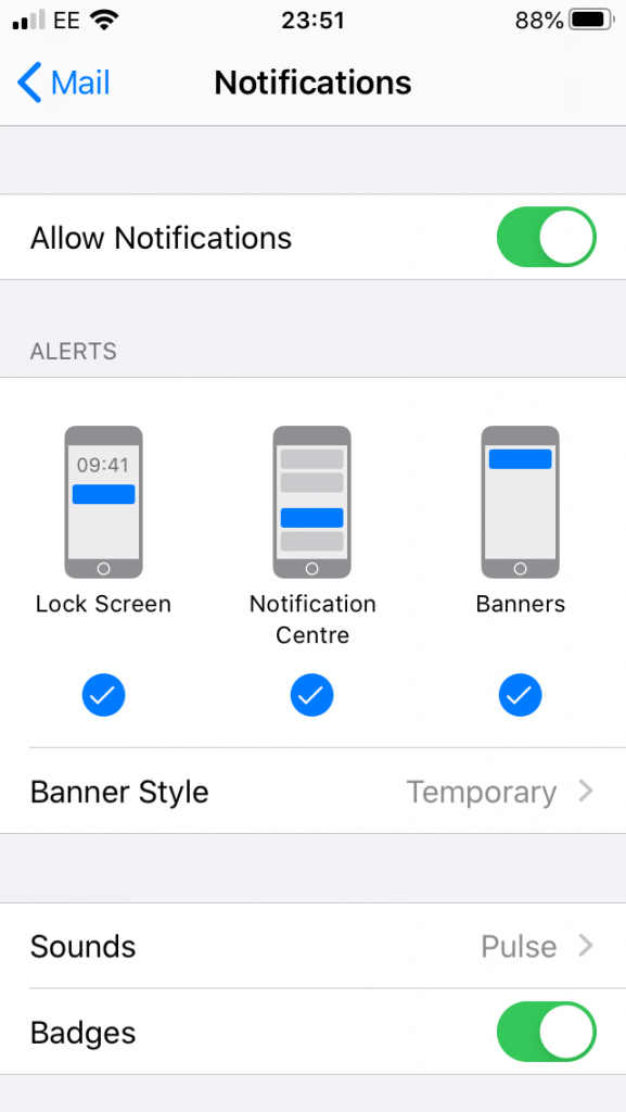 4. Ensure”Allow Notifications” is enabled, then click into each email account to select an Alert type: You can choose to have notification alerts to appear on your Lock Screen, Notification Center, or through notification Banners.